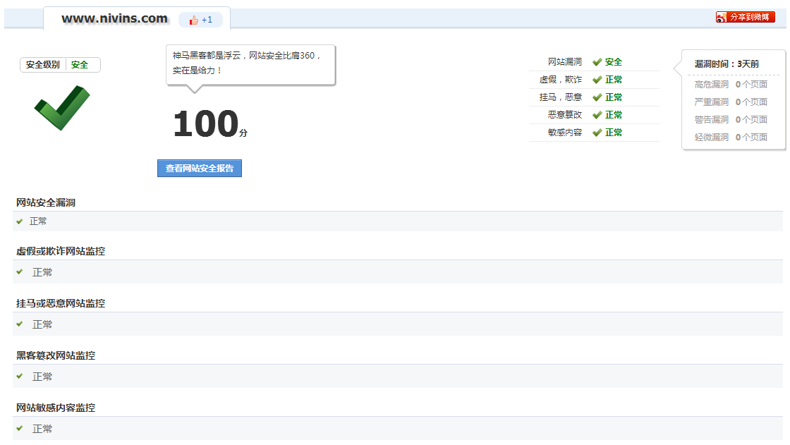 公司官網(wǎng)成功通過360網(wǎng)站安全在線檢測,沒有發(fā)現(xiàn)任何漏洞,得滿分100。一個互聯(lián)網(wǎng)安全的模范~給你一個安全的上網(wǎng)環(huán)境。