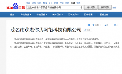 閱讀全文百度百科詞條【茂名市茂港你我網(wǎng)絡(luò)科技有限公司】: 茂名市茂港你我網(wǎng)絡(luò)科技有限公司,坐落在美麗的海濱城市——茂名市,公司設(shè)立在茂名市茂港區(qū)。詳細(xì)請點擊